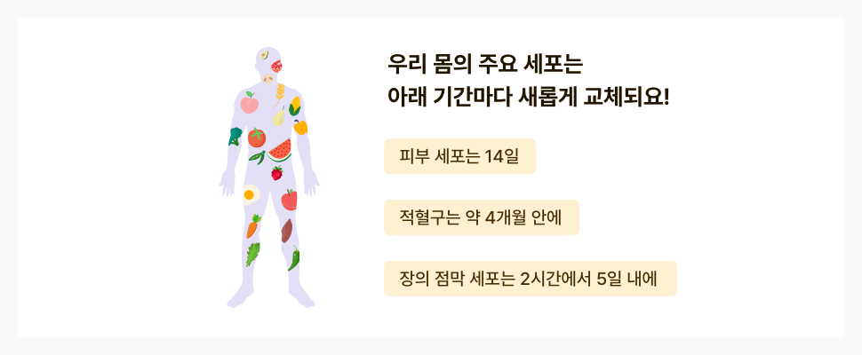‘I am what I eat’이라는 말이 있듯이 내가 먹는 음식이 나를 구성하고 나의 건강에 가장 큰 영향을 끼치는데요. 피부 세포는 14일, 장의 점막 세포는 2시간에서 5일, 적혈구는 약 4개월 안에 새롭게 교체되어요!
