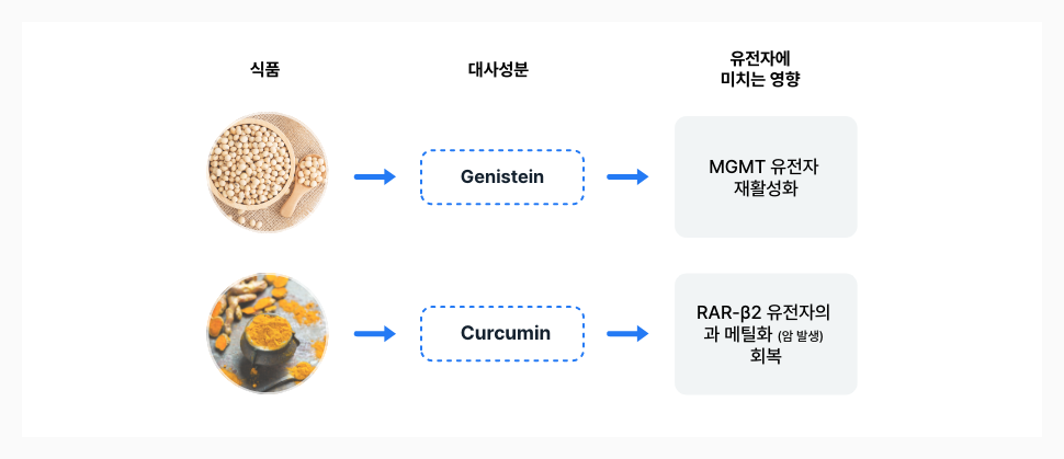 그리고 각각의 식품 안에는 대사성분이 있어요. 예를 들면 콩 안에는 이소플라본인 Genistein이 있고, 울금의 뿌리줄기에는 Curcumin이 있는데요, Genistein은 MGMT 유전자를 활성화해 암 발생을 억제하고 Curcumin은 RAR-β2 유전자의 과 메틸화를 회복시켜 암 발생을 억제해요.
